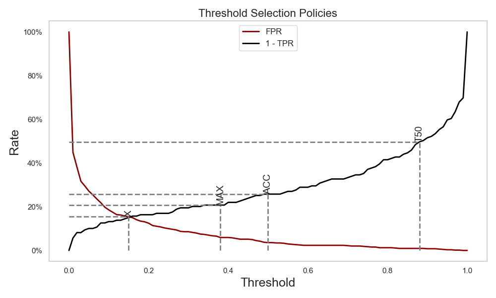 Comparison of different threshold selection policies showing FPR and 1-TPR curves with optimal thresholds for each method [Adapted from Forman (2008)]#