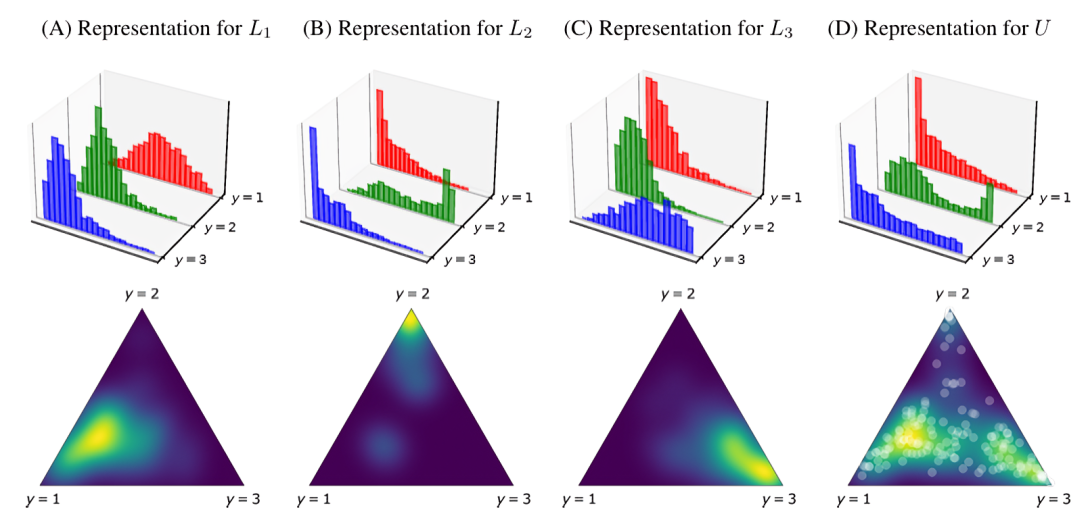 For example, in a 3-class problem (\(L1, L2, L3\)), instead of using three separate histograms for each class’s posterior probabilities, KDEy models a single 2D density over the simplex defined by the three classes. This allows it to capture how the probabilities for different classes relate to each other.